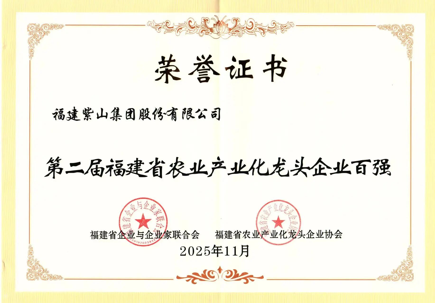 11月27日,福建省企業(yè)與企業(yè)家聯(lián)合會、福建省農業(yè)產業(yè)化龍頭企業(yè)協(xié)會在福州聯(lián)合發(fā)布第二屆福建省農業(yè)產業(yè)化龍頭企業(yè)100強榜單,紫山集團憑借卓越的綜合實力與深厚的產業(yè)根基再次榮耀登榜,榮獲第二屆福建省農業(yè)產業(yè)化龍頭企業(yè)100強。