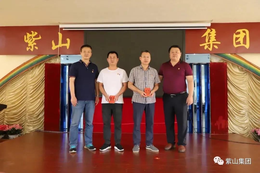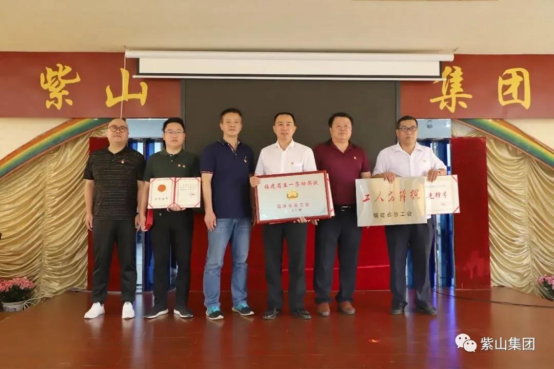 徐華利、楊懷生等為“省五一勞動獎狀”代表——紫山集團(tuán)總裁洪水河先生授牌頒獎。