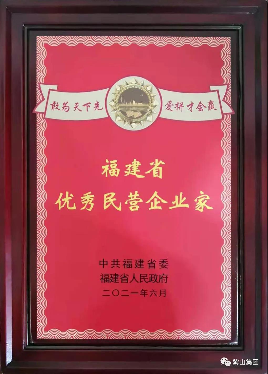 會上宣讀了《中共福建省委 福建省人民政府關于表彰福建省優(yōu)秀民營企業(yè)家和優(yōu)秀民營企業(yè)的決定》《中共福建省委關于表彰福建省民營企業(yè)黨建工作先進單位的決定》。紫山集團總裁洪水河榮獲“福建省優(yōu)秀民營企業(yè)家”稱號。獲此殊榮是對紫山集團總裁兼黨委書記洪水河工作和對紫山集團工作的肯定。