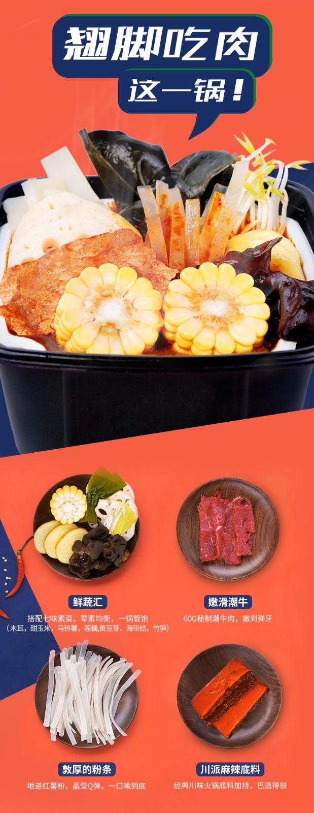秘制潮牛肉,嫩到彈牙。搭配七味素菜,葷素均衡,一鍋管飽。